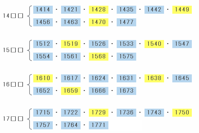 そこで次の図のように、「14□□」から「17□□」までをサクッと確認してみると、やはりそれぞれ条件に合うのは7個ずつであることが分かります。