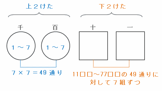 つまり上の図のように、上2けたの組み合わせは49通り、そして下2けたの組み合わせは「11□□」から「77□□」までの49通りに対してそれぞれ7組ずつあるので、答えは49×7=343通りです。
