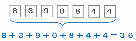 「8390844」に使われている7個の数の和を求めてみると、次の図のように36になります。