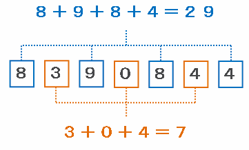 次は「8390844」の奇数番目の位と偶数番目の位にある数の和をそれぞれ求めてみると、