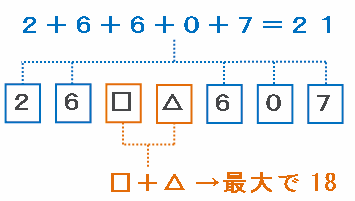 上の図の□と△にはそれぞれ0から9までの数字があてはまるので、「□+△」の答えは最大で9+9=18になります。