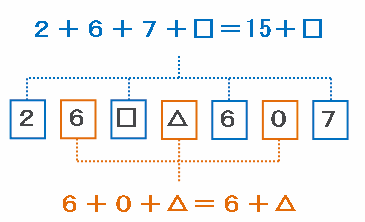 7けたの数「26□△607」に使われている各位の数の和を求めてみると、次の図のように「21」と「□+△」になります。