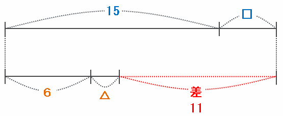 つまり、「15+□」と「6+△」の差は最も大きい場合でも24-6=18なので、この2つの数の差が11の倍数になるのは、次の図のように「15+□」と「6+△」の差が11になるときしかありえません。