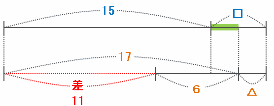 ただ、この図だと□と△との関係がちょっと分かりにくいかもしれないので下の図のように書きかえてみると、□と△との差(図の緑色の部分)は17-15=2であることが分かります。