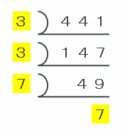 そこで、次の図のように441を素因数分解して素数の積に直してみると「3×3×7×7」となるので、アには3、イには7があてはまります。