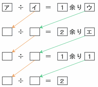 m=ア、n=イのとき、商が「1→2→1→2」で、余りが「ウ→エ→1→なし」となりました。ア~エにあてはまる数はそれぞれいくつですか。