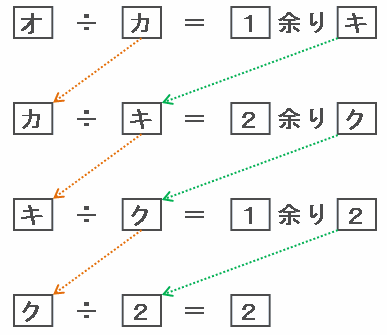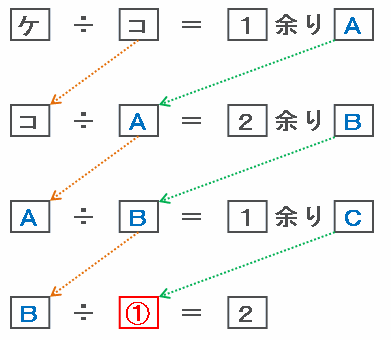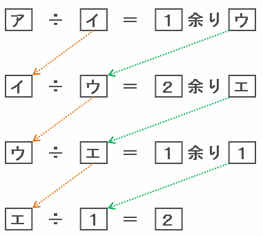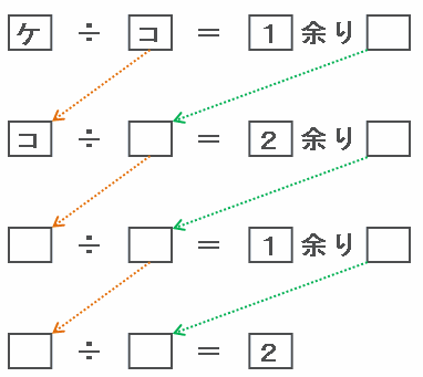 これを、余りがなくなるまでくり返します。このとき、求めた商と余りをそれぞれ、順番に→を使って書くことにします。