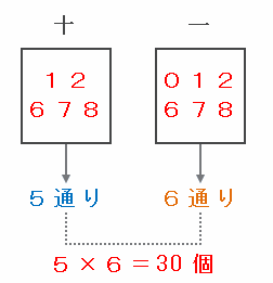 上の図で十の位と一の位の合計が7となる組み合わせは「0・7」、「1・6」、「6・1」、「7・0」の4通りあります。