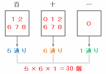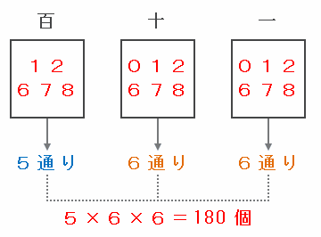 となるので、それぞれの組み合わせで3けたの数が何通りできるか調べてみると、