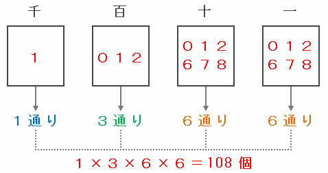 ただし、その18個の中で「1280」は1278を超えているので除くと、4けたの数は18-1=17個です。