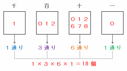 ※ 十の位と一の位の和は最大でも8+8=16。4けたの数「10□□」の各位の和を18にしたくても、十の位と一の位の和を18-1=17にはできないので、各位の和が9となる場合だけを考えればOK。