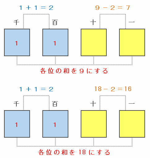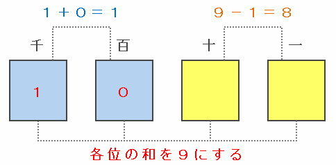 たとえば4けたの数「10□□」を9の倍数にする場合、次の図のように千の位と百の位の合計が1+0=1なので、十の位と一の位の合計は9-1=8になります。