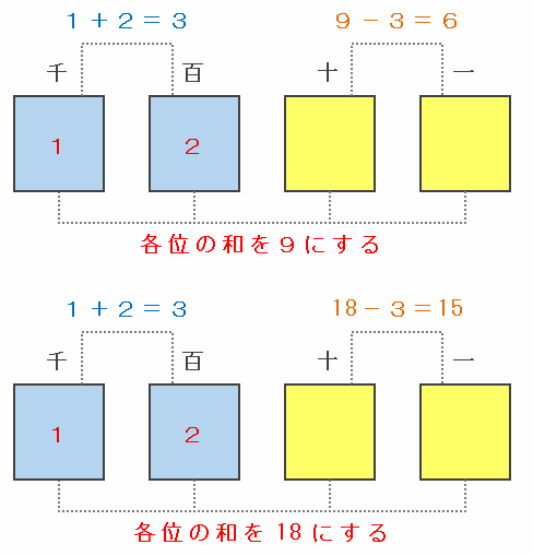 ・各位の数の和を18にする→十の位と一の位の合計は18-3=15。