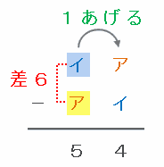 その後で十の位にある「イ」から「ア」を引いたら5になったので、「イ」は「ア」よりも5+1=6大きいことが分かります。