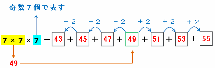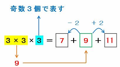 同じ数を3回かけた数の答えは、次のような連続する奇数の和に直すことができます。