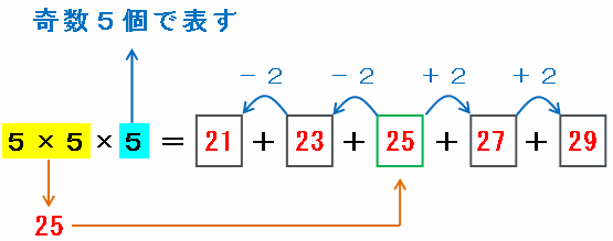 同じように「5×5×5」の場合を考えてみると、「5×5」の答えである25を5個ならべればOKなので、次の図のように真ん中に25を置き、その左右に連続する奇数を2個ずつならべれば25が5個あることになります。