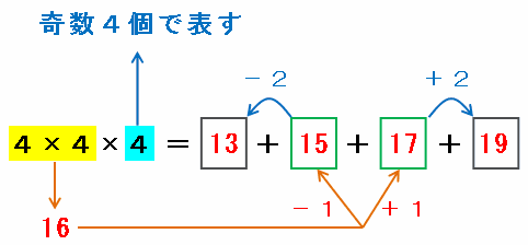 「4×4×4」は「4×4」の答えである16が4個あるという意味ですが、16は偶数なので「連続する奇数の和」には使えません。