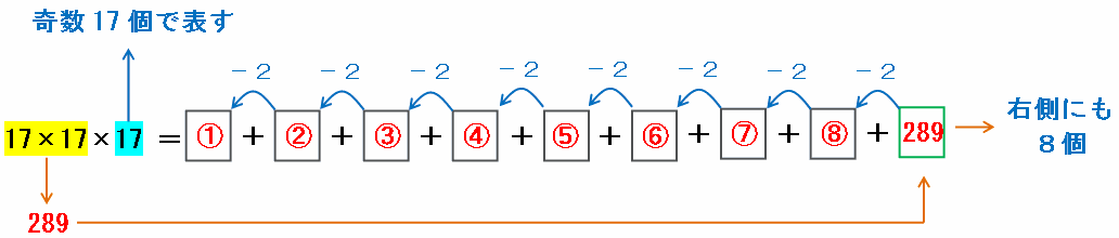 「17×17×17」は「17×17」の答えである289が17個ある、という意味なので、まずは17個の奇数の真ん中に289を置き、その左側には2ずつ小さい数を8個、そして右側には2ずつ大きい数を8個ならべれば完成です。