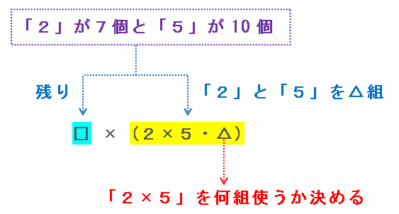 そのとき、「2」の残りは7-4=3個、「5」の残りは10-4=6個となり、□にはそれらを全部かけ合わせた数である2×2×2×5×5×5×5×5×5=125000があてはまるので、(□・△)=(125000・4)という組み合わせができます。