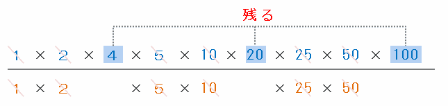 <100>÷<50>は、次の図のように100の約数を分子、50の約数を分母において計算すればOKなので、分子と分母で同じ数を約分すると、分母はすべて1になり、分子に「4」、「20」、「100」の3つが残ります。