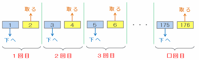 上の図のようにカードを2枚ずつの組に分けると、偶数の最後のカードである「176」は176÷2=88組目なので、答えは88回目です。