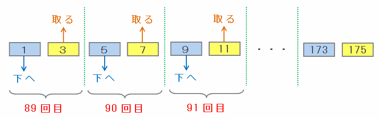 ※ 88回目は、88番目の奇数である「175」が一番下へ行き、「176」が取り除かれる。