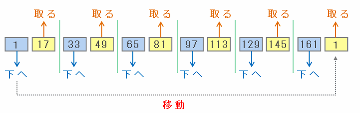 ・下へ移動するカード→1から始まって4ずつ増えていく