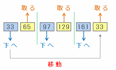 という操作が行われるので、その時点で残ったカードは上から順に「33・65・97・129・161」の5枚になります(次の図参照)。