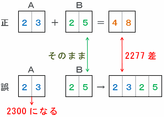 しかし「+」を抜かしてしまうと、Aにあてはめた23は2300として扱われるので、4けたの数2325になってしまいます。