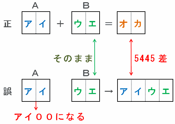 ここで次の図のように、連続する2つの奇数をそれぞれAとBとおくと、答えの差である5445は、Aにあてはめた2けたの奇数「アイ」が、間違った計算では4けたの数「アイ00」として扱われたために生じたものです。