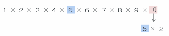 たとえば次の図のように、1から10までの整数をすべてかけ合わせると、その中には「5」と「10=5×2」の2か所に5が1個ずつあるので、そのかけ算の答えは5で2回まで割れます。