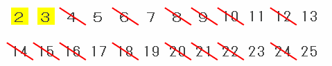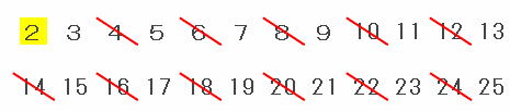 例えば4から24までの2の倍数を「2」と一緒に取り出すとすべて袋の外に出されるので、それらを次の図のようにすべて消していきます。