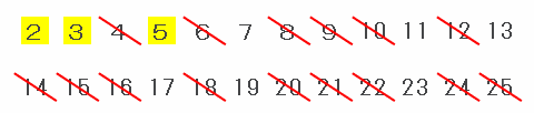 次に5の倍数である25を消したとき、残りはすべて素数となるので、他の数の倍数になることはありません。