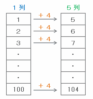 ・5列目→1+4=5から100+4=104までの100個の整数が縦に並んでいる