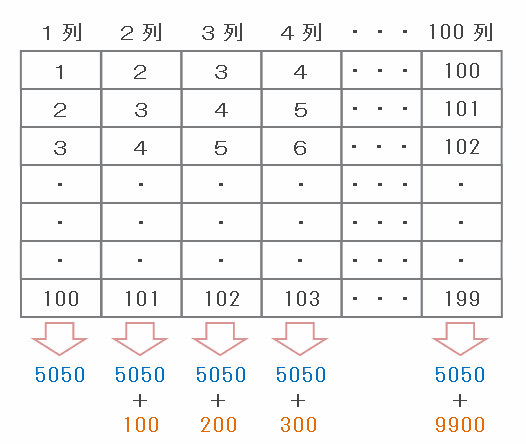 ・100列目→1列目に並ぶ数よりも99ずつ大きいので、5050+99×100