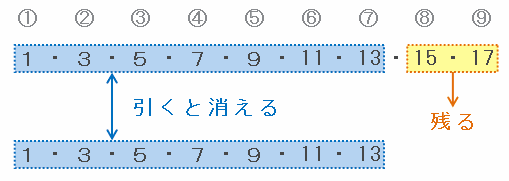 「1から9番目までの奇数の和」から「1から7番目までの奇数の和」を引くと、次の図のように8番目と9番目の奇数だけが残るので、15+17=32と求めてもOKです。