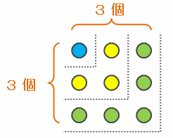 1番目の奇数は1、2番目の奇数は3、3番目の奇数は5なので、次の図のように青い○を1個、黄色い○を3個、緑色の○を5個並べてみると、全体は1辺が3個の正方形となり、○の総数は「3×3」を計算すれば求められます。