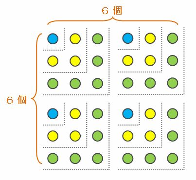 1辺3個の正方形を4つ並べると、全体は1辺が3×2=6個の正方形になるので、○の総数は「6×6」を計算すれば求められます。