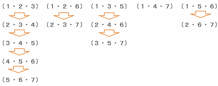 ただし、この問題の場合は使える数が1から7までなので、3つの数のうちのどれかが7になった時点で終わりです。