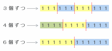 12個並んだ「1」を次の図のように4個ずつ分けた場合、6個ずつ分けた場合についても同じように考えてみると、