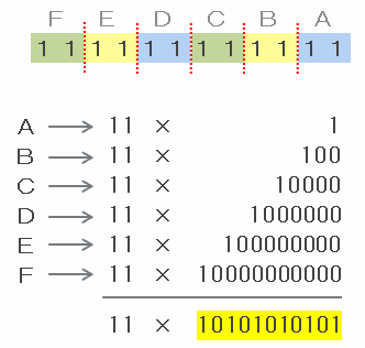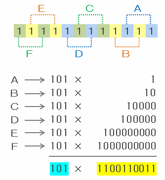 12個並んだ「1」を、次の図のように1個飛ばしで2個ずつのペアにしてみると、A~Fはすべて「101×□」という形で表すことができます。