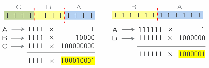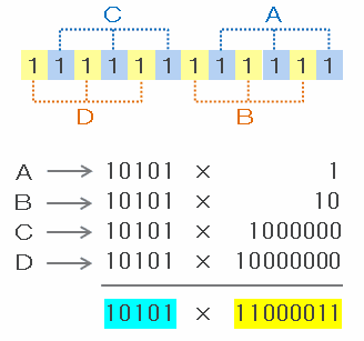 それらを下の図のように縦に並べて筆算してみると「10101×11000011」となるので、「10101」と「11000011」も約数です。