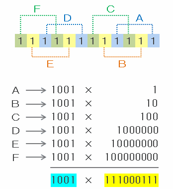 それらを下の図のように縦に並べて筆算してみると「1001×111000111」となるので、「1001」と「111000111」も約数になります。