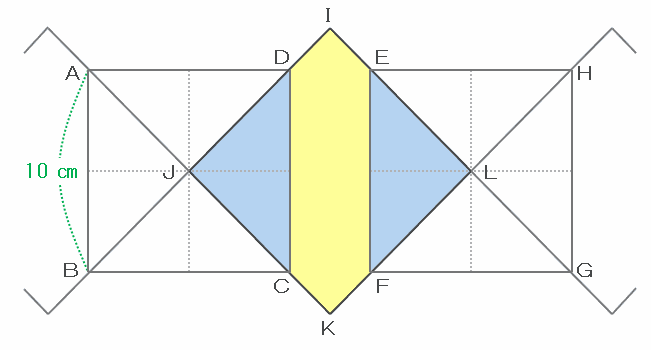 上の図の正方形IJKLの面積は10×10=100㎠、青い三角形2つ分の面積は50㎠なので、黄色い六角形の面積は100-50=50㎠です。