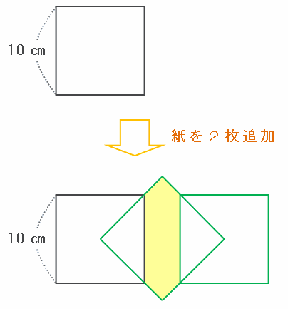 次の図のように、まずは正方形の紙を1枚置いてから、紙を2枚ずつつなげていくごとに、黄色い六角形が1個ずつ増えていきます。