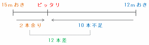 木と木の間隔を15mにすると木が2本余り、12mにすると10本足りないので、15mおきと12mおきで使う木の本数の差は、次の図のように2+10=12本であることが分かります。