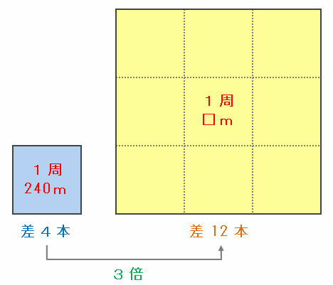 つまり次の図のように、1周240mだと差が4本、実際の差は12本なので、1周の長さを12÷4=3倍にすれば、12mおきと15mおきに木を植えたときに必要な木の本数の差が12本になるはずです。