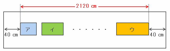 壁の幅22m=2200㎝のうち、両端の40㎝ずつはポスターをはれないので、実際には次の図のように2200-40×2=2120㎝のスペースを利用してポスターをはります。