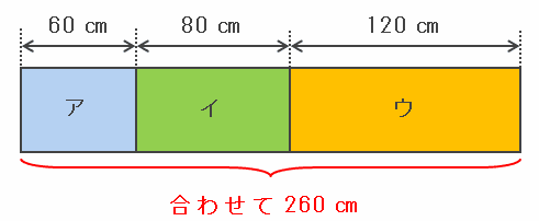 また、3種類のポスターを次の図のように1セットにすると、その横幅は60+80+120=260㎝になるので、3種類のポスター7枚ずつの横幅の合計は260×7=1820㎝です。