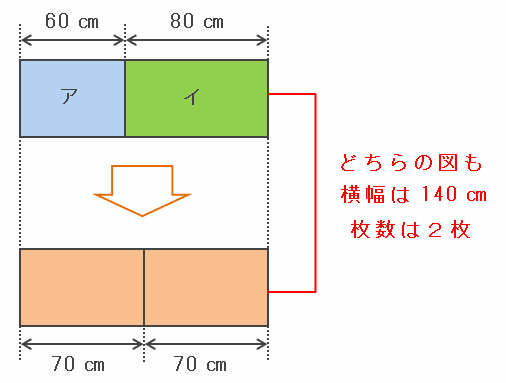 つるかめ算を利用したいのですが、ポスターが3種類のままだと公式が使えないので、同じ枚数ずつあるアとイの1セットを、次の図のように(60+80)÷2=70㎝のポスターが2枚ずつあると考えて問題を解きます。